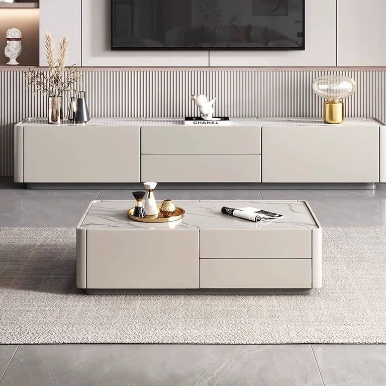 وحدة تلفزيون أنيقة تجمع بين الخطوط الهادئة والوظيفة العملية، مصنوعة من الخشب الطبيعي بواجهات مضلّعة متحركة وقاعدة بأرجل كروية تضيف لمسة تصميم مميزة لغرفة المعيشة.