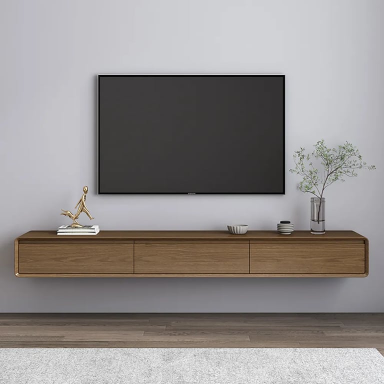 وحدة تلفزيون معلّقة مصنوعة من خشب طبيعي متين بتشطيب دافئ، تحتوي على 3 أدراج واسعة لحياة أنيقة ومنظمة.