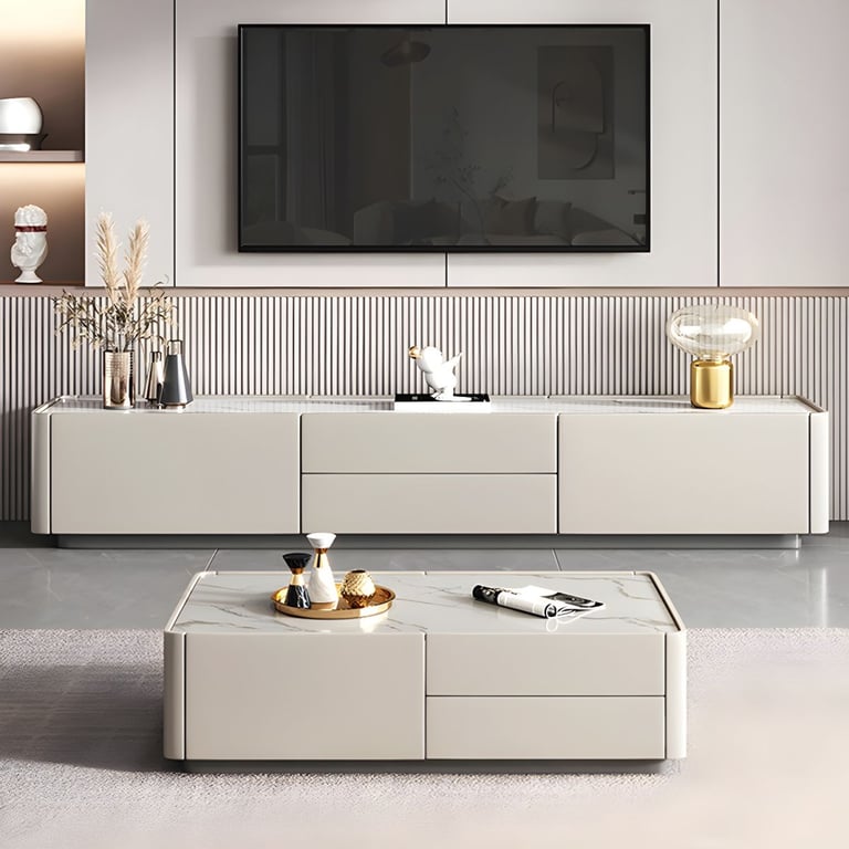 طاولة قهوة عصرية بسطح حجري أنيق وأدراج مخفية، مصنوعة من خشب طبيعي مقاوم للرطوبة والتشققات والحشرات — أنيقة، متينة، وذكية.