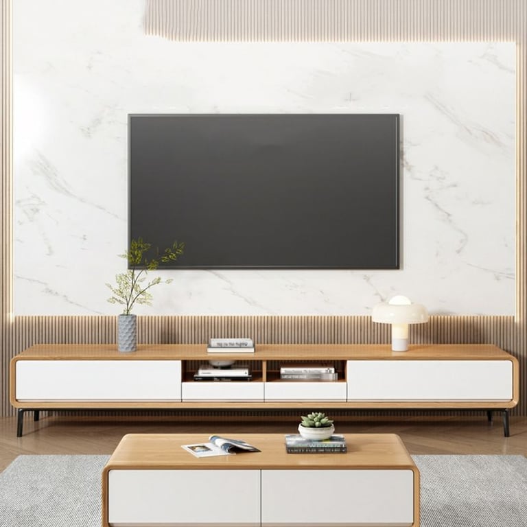 وحدة تلفزيون أنيقة تجمع بين الخطوط الهادئة والوظيفة العملية، مصنوعة من الخشب الطبيعي بواجهات مضلّعة متحركة وقاعدة بأرجل كروية تضيف لمسة تصميم مميزة لغرفة المعيشة.