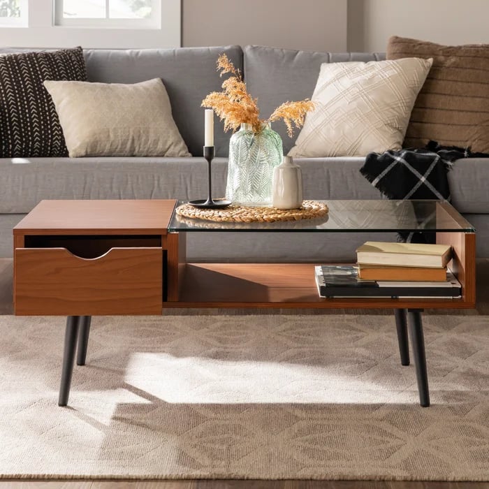 طاولة قهوة أنيقة تجمع بين الزجاج الشفاف والخشب الطبيعي، تضيف لمسة عصرية خفيفة لأي مساحة مع حفاظها على الدفء والعملية.