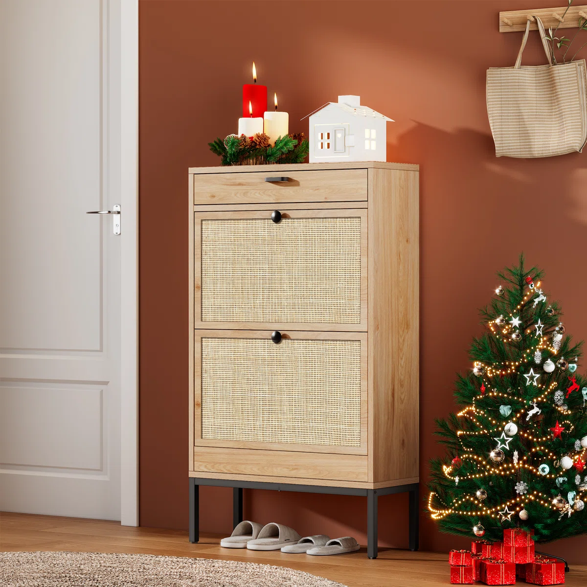 خزانة أحذية أنيقة تجمع بين دفء الخشب الطبيعي وجمال الراتان، مع تصميم قلاب عملي يوفر تخزينًا منظّمًا ومظهرًا ديكوريًا راقيًا للمداخل الحديثة.