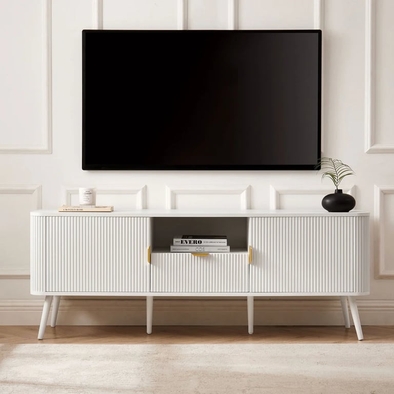 وحدة تلفزيون من الخشب الطبيعي بتصميم عصري أنيق مع مساحة تخزين عملية تناسب مختلف الديكورات.