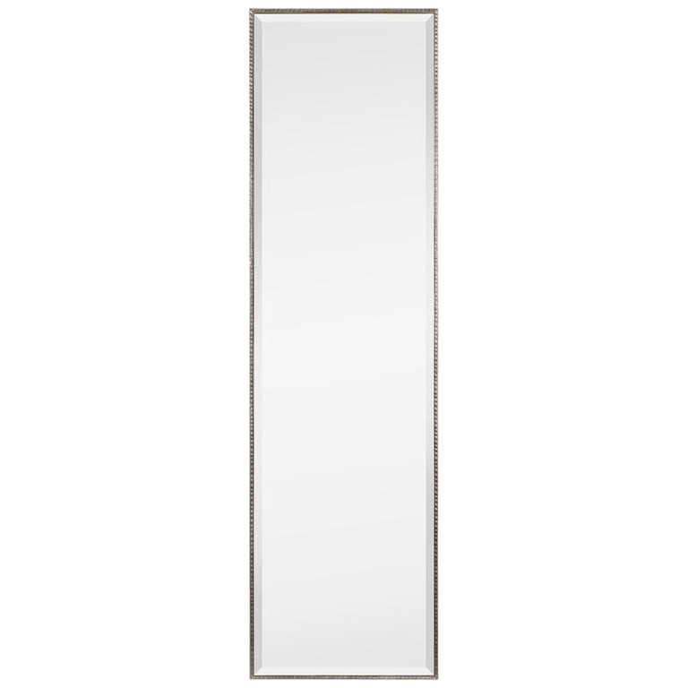 مرآة بإطار خشبي مستطيلة مثبتة على الأرض تمكنك من تفقد مظهرك من الرأس إلى القدمين، كذلك تضفي لمسة من الرقي والفخامة لديكور المكان الذي توضع به، مناسبة لغرفة الملابس أو إلى جانب الباب، ستستفيد من وجودها في كل حال.