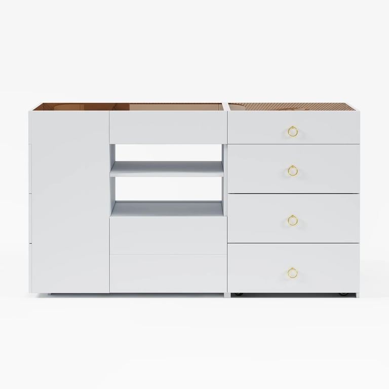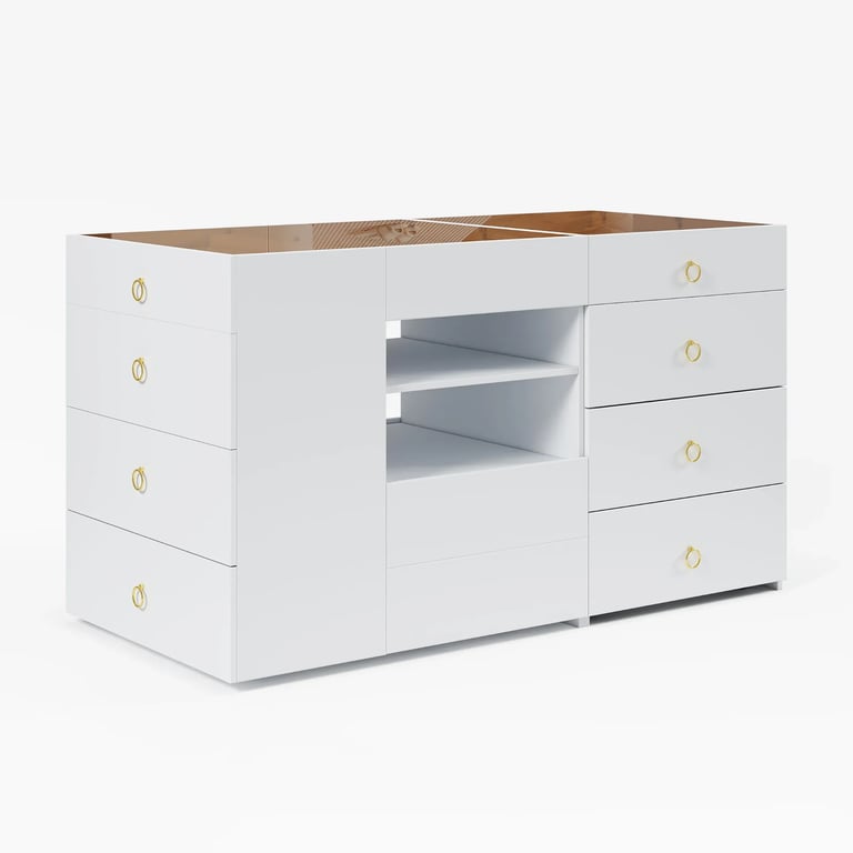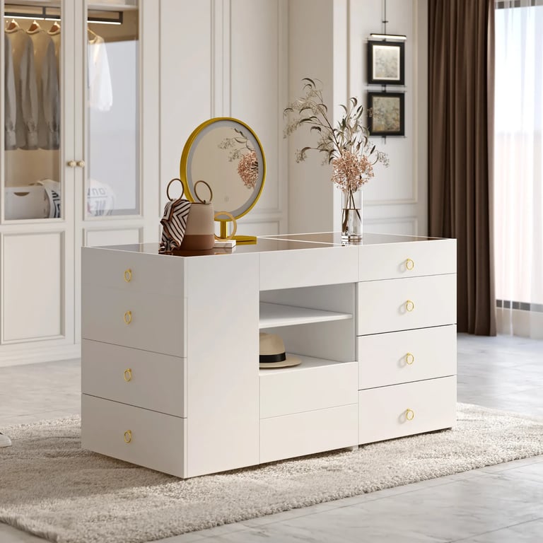 خزانة أوبريل تجمع بين التصميم العصري والأناقة العملية. مصنوعة من الخشب الطبيعي المقاوم للماء والتشققات والحشرات لتدوم لسنوات طويلة بجمالها وقوتها. تحتوي على عدة أدراج واسعة لتخزين الملابس والأغراض المختلفة، بالإضافة إلى منظمات علوية مدمجة لتقسيم الإكسسوارات والأدوات اليومية بشكل مرتب وسهل. بلمسة نهائية باللون الأبيض ومقابض ذهبية أنيقة، تصبح هذه الخزانة إضافة مثالية لغرف النوم أو غرف الملابس العصرية.