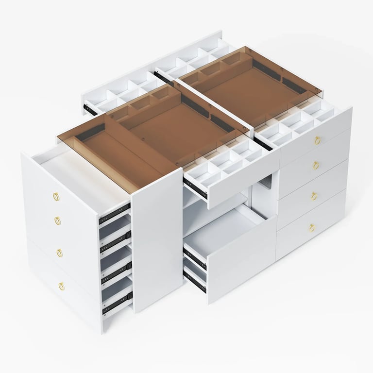 خزانة عصرية مصنوعة من الخشب الطبيعي مزودة بأدراج متعددة ومنظمات داخلية، تجمع بين الأناقة والعملية.