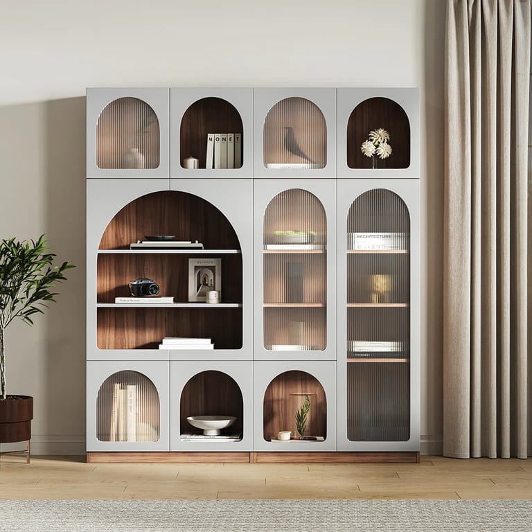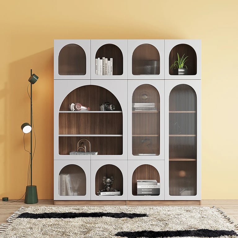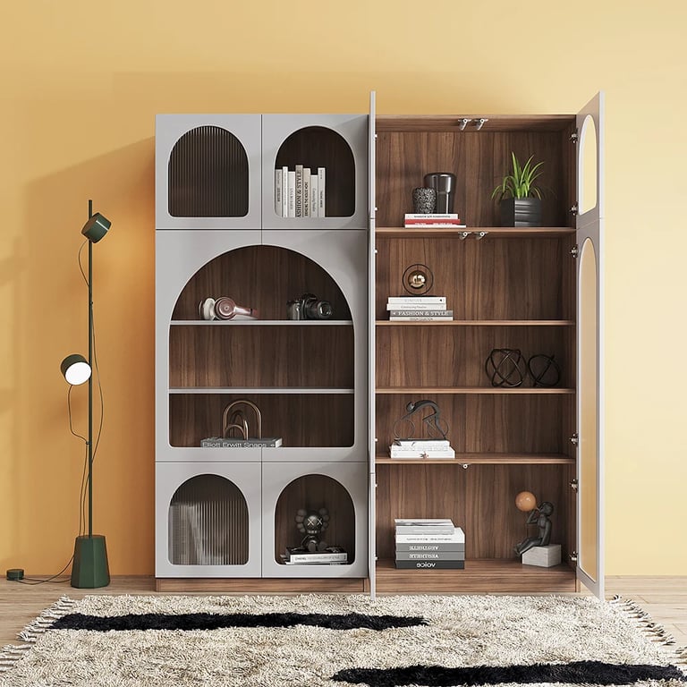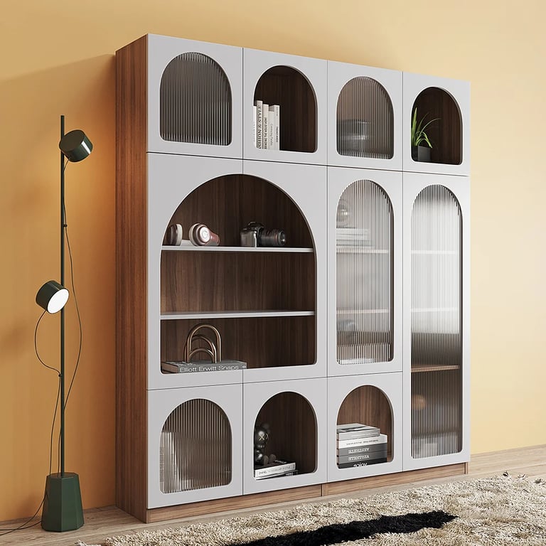 مورا خزانة كتب حديثة مصنوعة من الخشب الطبيعى مع أرفف متوسطة الحجم قابلة للتعديل و خزانات متعددة مع ابواب مصنوعة من الأكليريك الشفاف مما يتيح لك تعدد استخداماتها .