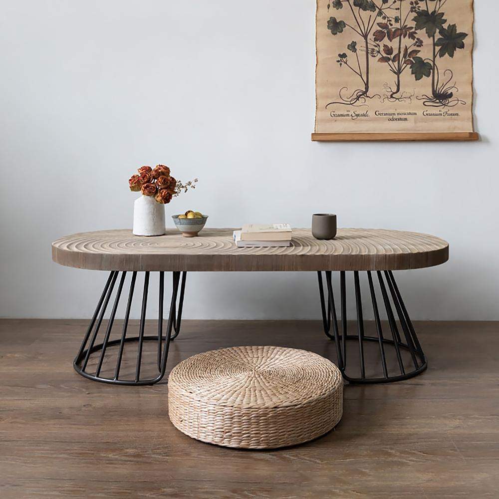 طاولة قهوة عصرية مصنوعة من الخشب الطبيعي، تتميز بسطح منحوت بتفاصيل حلقية أنيقة وشكل بيضاوي لافت، مع أرجل معدنية سوداء تضيف توازنًا وقوة للتصميم.