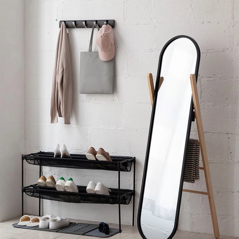 .مرآة أرضية بطول كامل بتصميم خشبي طبيعي أنيق، تجمع بين الانعكاس الواضح والعملية اليومية، مزودة برف سفلي مثالي للتخزين وإضافة لمسة ديكورية بسيطة للمكان