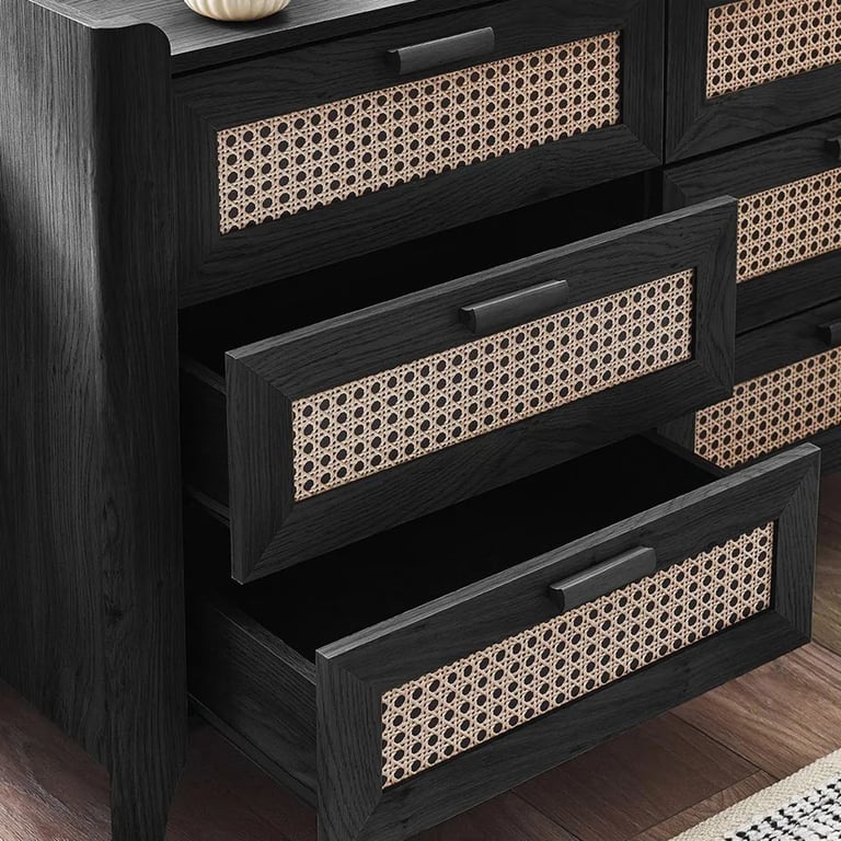 واسعة وأنيقة ومليئة بالتباين – تجمع “زينو” بين أناقة الخشب الأسود وملمس الراتان الطبيعي في خزانة ذات ٦ أدراج بتصميم لا فت.