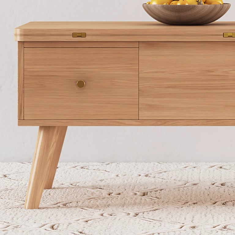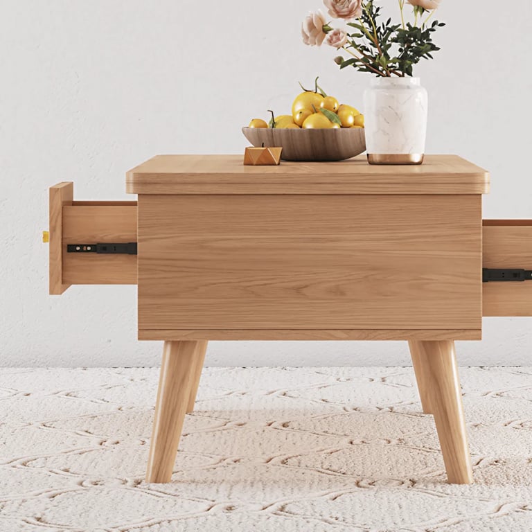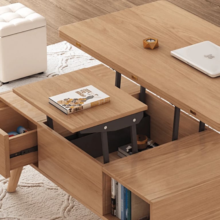 طاولة قهوة متعددة الوظائف مصنوعة من الخشب الطبيعي، بتصميم أنيق وسطح قابل للرفع مع أدراج مخفية – عملية للتخزين والعمل.