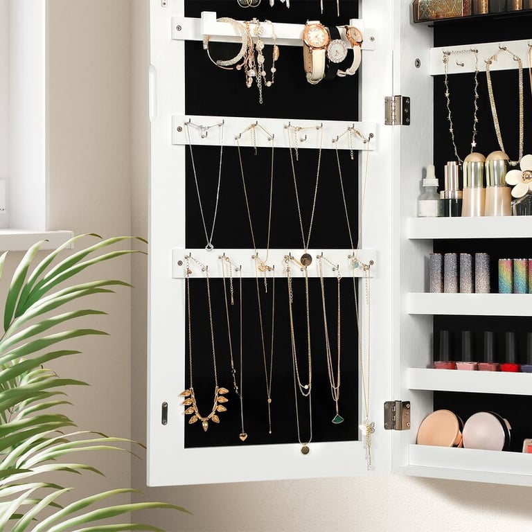 خزانة مجوهرات ومرآة تعلق على الحائط تم تصنيعها من خامات طبيعية بجودة عالية، تستطيع بسهولة تعليقها على الحائط بطريقتين أما بخطافات أو من خلال البراغي، كما إنها تأتي بثلاثة ارتفاعات مختلفة للاختيار من بينها.