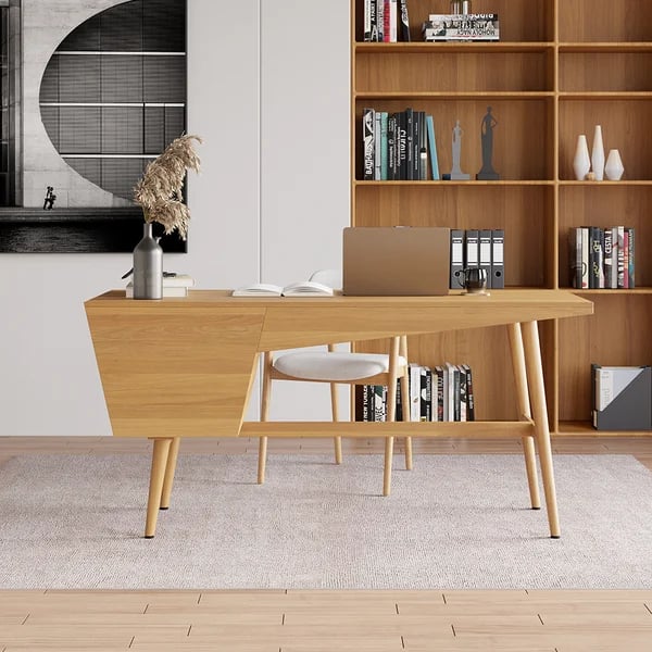 مكتب خشب طبيعي دافئ بسطح مستطيل ودرجين — صُمم ليجمع بين المتانة، الأناقة، والتنظيم اليومي.