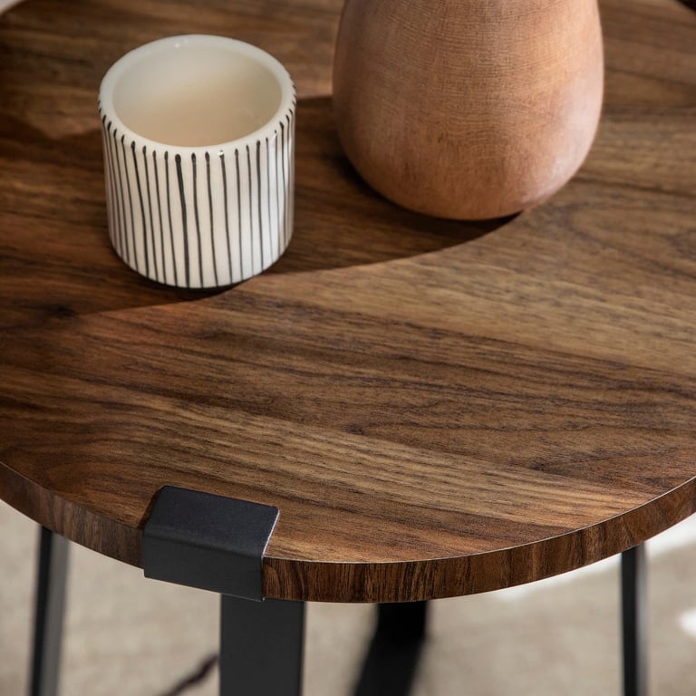 أضف السحر الصناعي والريفي إلى مساحة معيشتك مع هذه الطاولة الجانبية المستديرة. يتميز تصميمه الفريد بأرجل معدنية تلتف حول سطح الطاولة المصنوع من الخشب الصناعي لمزيد من الثبات.