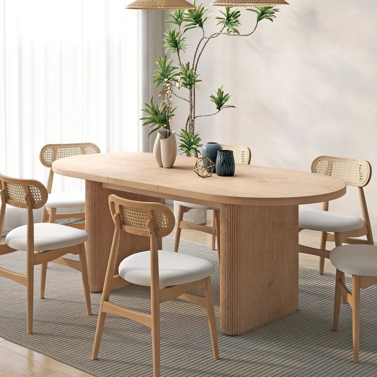 تضيف طاولة السفرة الخشبية هذه لمسة من الأناقة والدفء إلى غرفة الطعام، حيث تجمع بين التصميم العصري والتفاصيل الكلاسيكية الراقية. مصنوعة من خشب طبيعي عالي الجودة، مما يجعلها متينة وطويلة الأمد. تصميمها البيضاوي الناعم مع الأرجل المخططة يضفي لمسة فريدة تتناسب مع مختلف أنماط الديكور.
