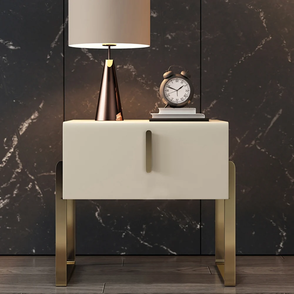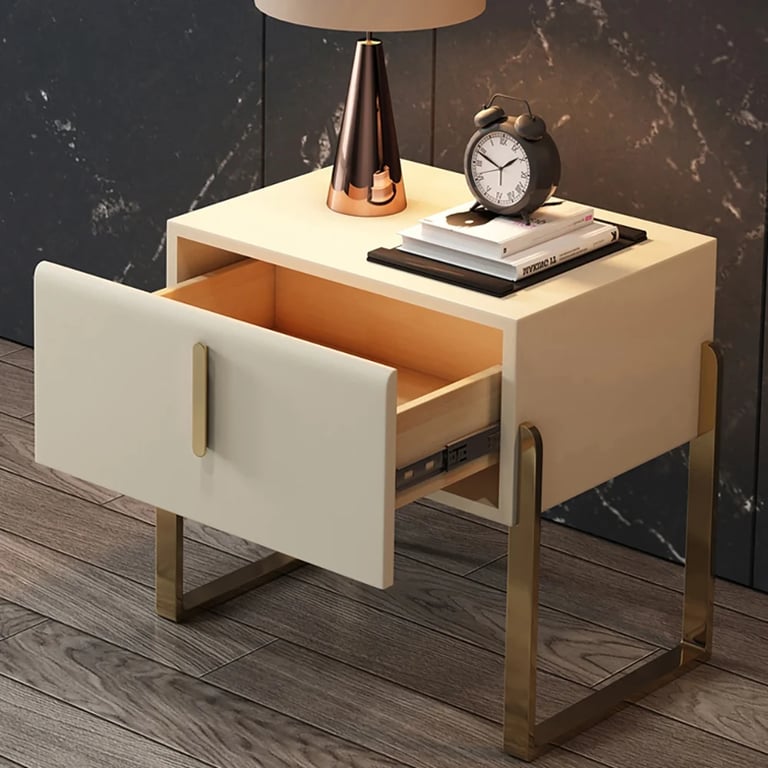 احصل على هذه المنضدة العصرية والأنيقة. تتميز هذه المنضدة بتصميم أنيق وعصري يكمل ديكور أي غرفة نوم. تضفي المفروشات الجلدية ذات اللون الأبيض الفاتح والأجزاء المعدنية المطلية بالذهب على هذه المنضدة إحساسًا فاخرًا.