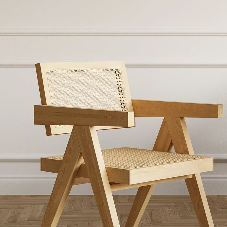 1. تصميم مينيمالي بإطار خشبي ومقعد وظهر من الراتان الطبيعي المنسوج يدويًا.