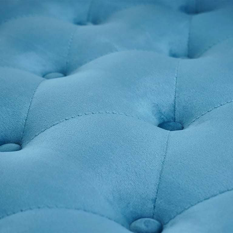 1. صميم فاخر ومبهر تتميز بتنجيد مخملي أزرق مزينة بمسامير تنجيد معدنية أنيقة على طول الواجهة الأمامية مما يضيف لمسة من البذخ.