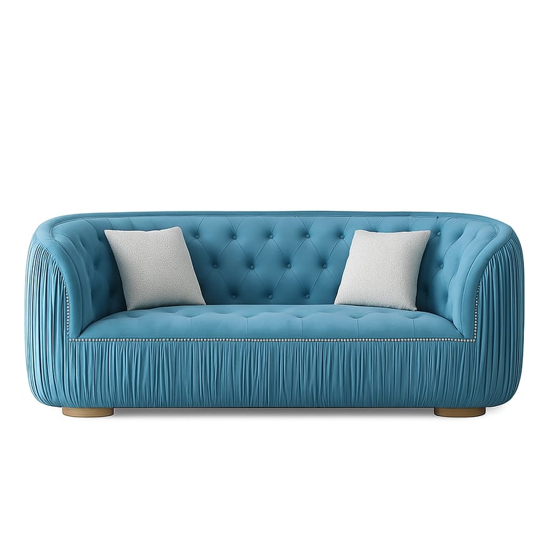 أضف لمسة من الفخامة الفريدة والألوان الجريئة إلى مساحتك. تتميز كنبة 'سيلستا' المخملية بتصميمها الكلاسيكي المعاصر وتفاصيل التنجيد الأنيقة، فهي قطعة فنية تحول أي غرفة إلى صالون ملكي. اللون الأزرق الزاهي والتفاصيل الذهبية تجعلها مركز الأناقة. ترتكز على قاعدة خشبية توفر ثباتاً فائقاً. توفر مساحة جلوس مريحة لثلاثة أشخاص، مما يجعلها مثالية للتجمعات العائلية أو استقبال الضيوف.