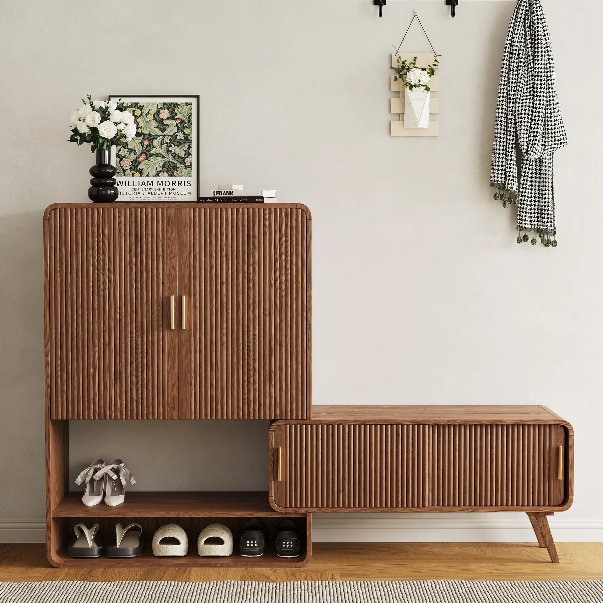 خزانة أحذية أنيقة بتصميم عصري فاخر، مصنوعة من الخشب الطبيعي لتوفر تخزينًا عمليًا ولمسة راقية تليق بمدخل منزلك.