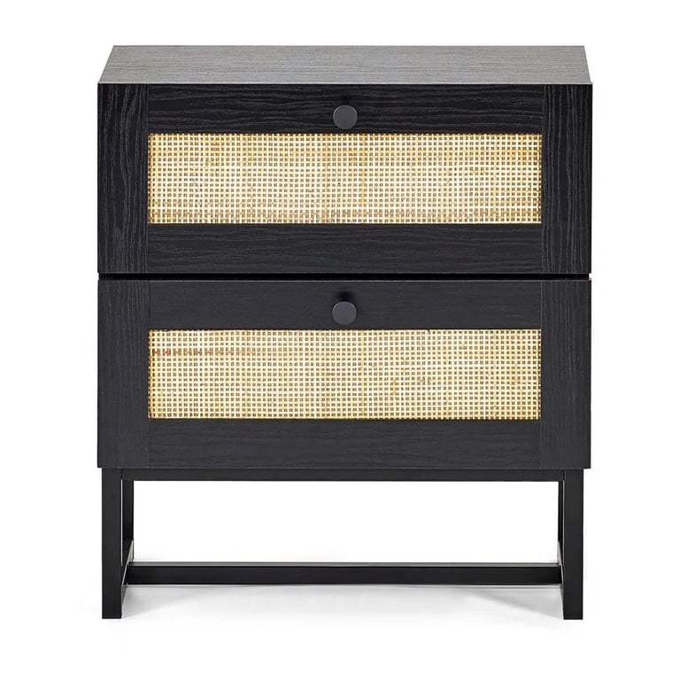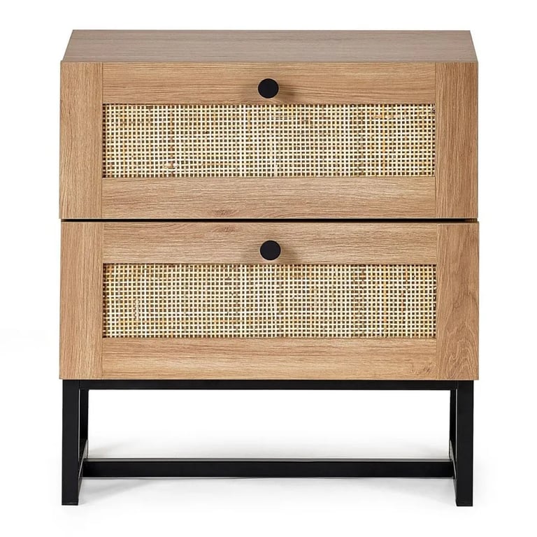 الرئيسية المتجر أثاث غرف النوم كومود ميرا طاولة جانبية خشب طبيعى - درجين من الراتان وقاعدة معدنيه سوداء أنيقة