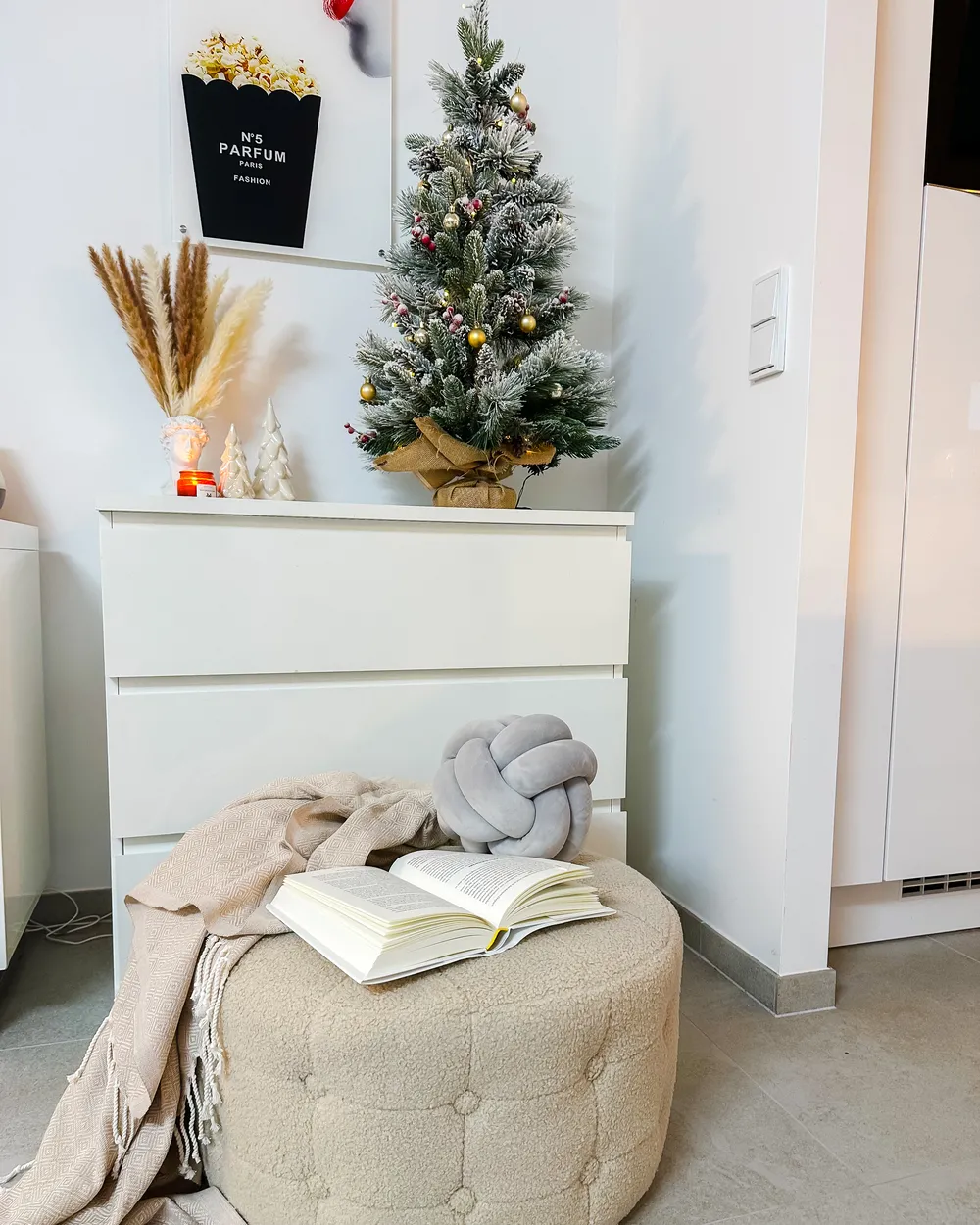 مقعد صغير بتصميم يدوي من الخيوط الطبيعية وإطار من الخشب الطبيعي، يجمع بين البساطة والجمال.