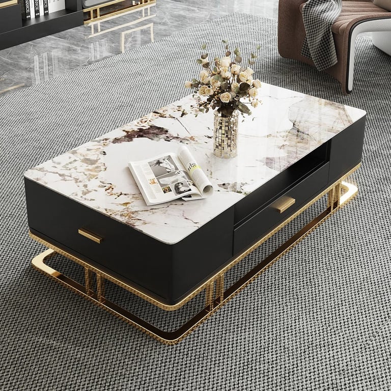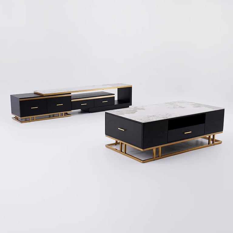 نوكتورن — طقم وحدة تلفزيون وطاولة قهوة من الخشب الطبيعي والاستانلس الذهبى وسطح من بديل الرخام