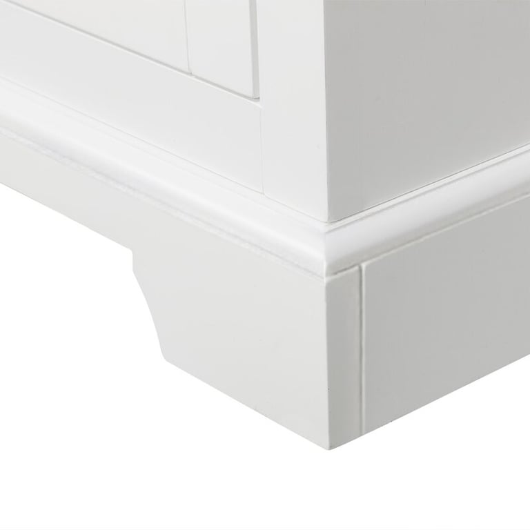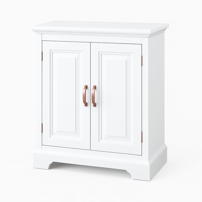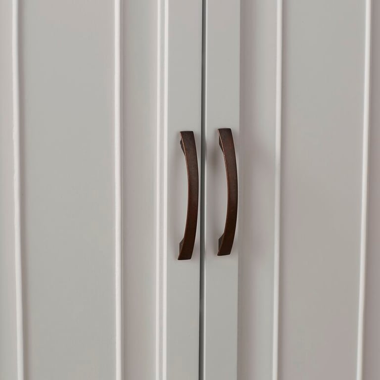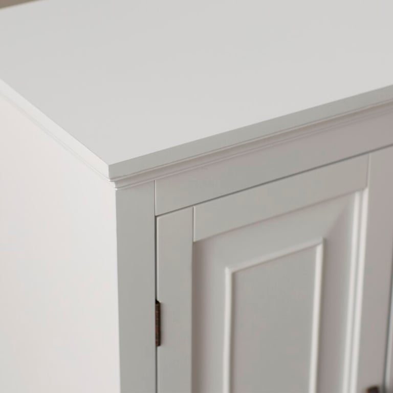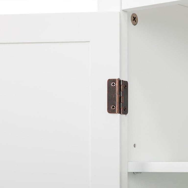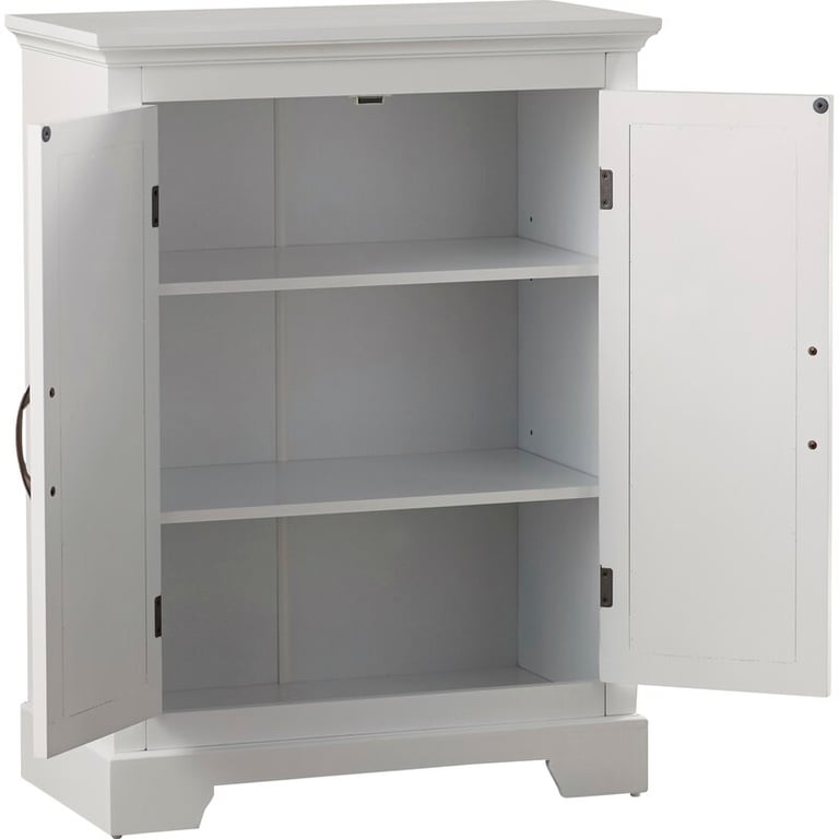 An over-the-toilet storage cabinet crafted from natural wood with a crisp white finish, featuring a classic design, brushed nickel hardware, and ample storage space for modern bathrooms.