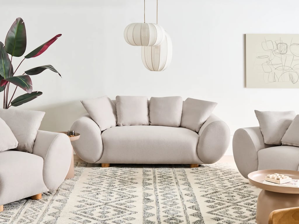 This three-seater sofa, crafted from natural wood, combines a modern design with gentle, flowing curves. Its soft, neutral-toned upholstery adds a sophisticated and comfortable touch to any living space.