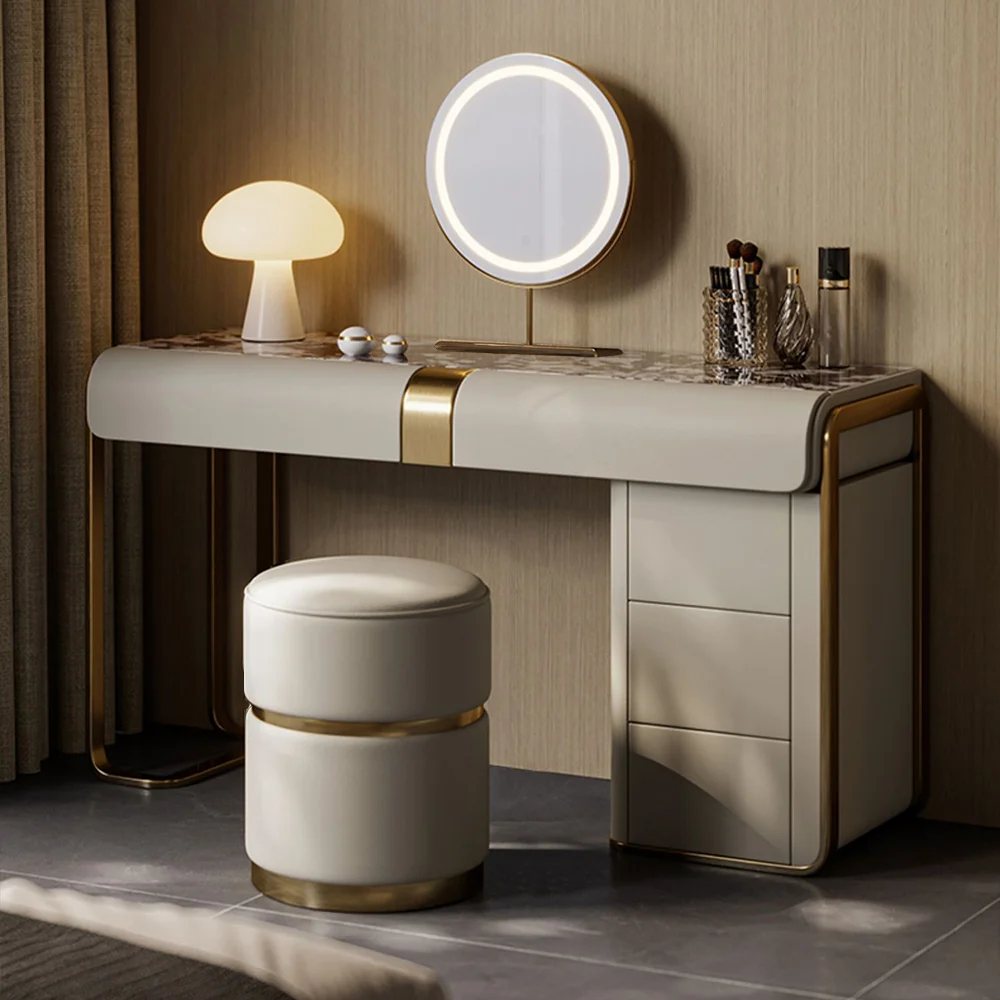 The Amoura vanity set features a design that perfectly blends modern luxury with everyday functionality. Crafted from high-quality natural wood resistant to cracks, moisture, and insects, it’s accented with touches of gold stainless steel, and a refined marble-look top that’s easy to clean. The circular mirror includes soft LED lighting for ideal illumination, complemented by a matching pouf with a golden stainless-steel base that adds harmony and elegance to the space. The set also includes smooth drawers for neatly organizing your essentials, while the elegant golden details enhance its overall sense of sophistication.