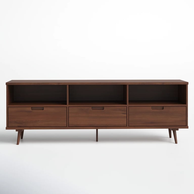 A refined TV unit crafted from natural wood, featuring three spacious drawers and open shelves for balanced and practical storage.