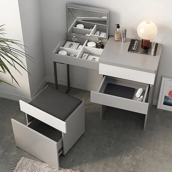 A modern multifunctional vanity that transforms from a sleek storage unit into a dressing table with a hidden mirror and stool.