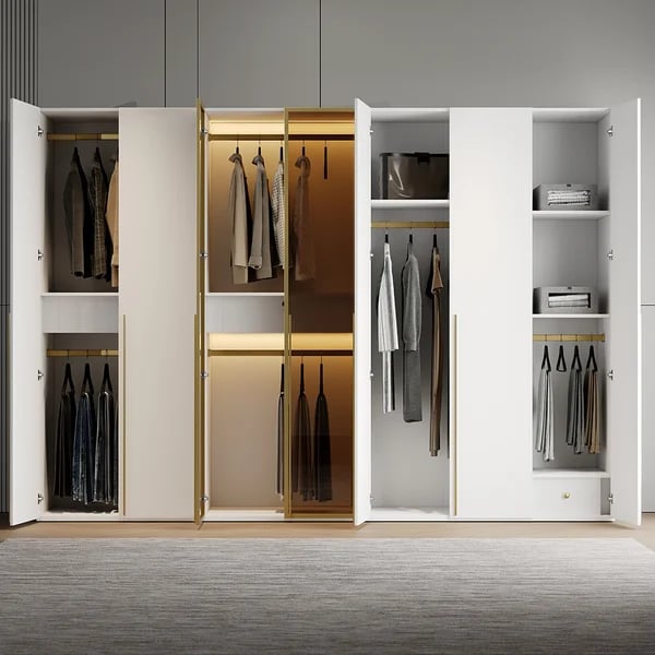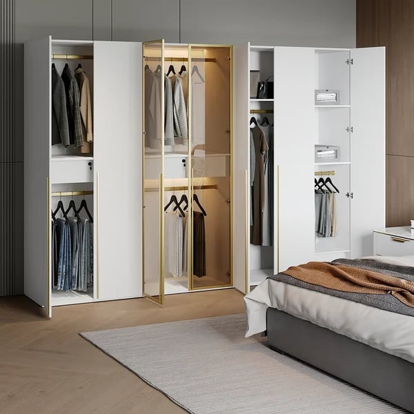 Get our stunning wardrobe, a perfect blend of elegance and functionality. This wardrobe is sure to add a touch of sophistication to any space. Experience the perfect blend of style, functionality, and innovation with our white, gold, and brown wardrobe. Transform your space into a haven of elegance and organization.