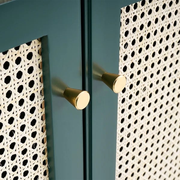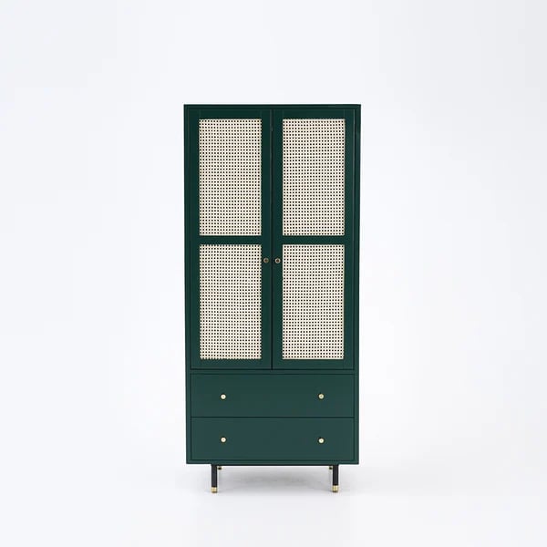 This green rattan woven cabinet is on-trend and of timeless quality, and will make a statement anywhere. It has an elegant, classic design. The two doors reveal spacious storage spaces for your clothes and two large drawers with gold handles that match the green color for additional storage. Expertly crafted with a high-quality solid wood frame, ensuring a lifetime of support and stability. Keep your room clean and tidy with this product.