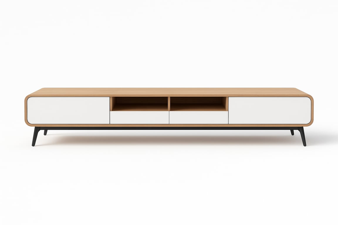 A stylish Scandinavian-inspired TV stand made from natural wood, featuring a low-profile silhouette, spacious storage, and effortless charm.