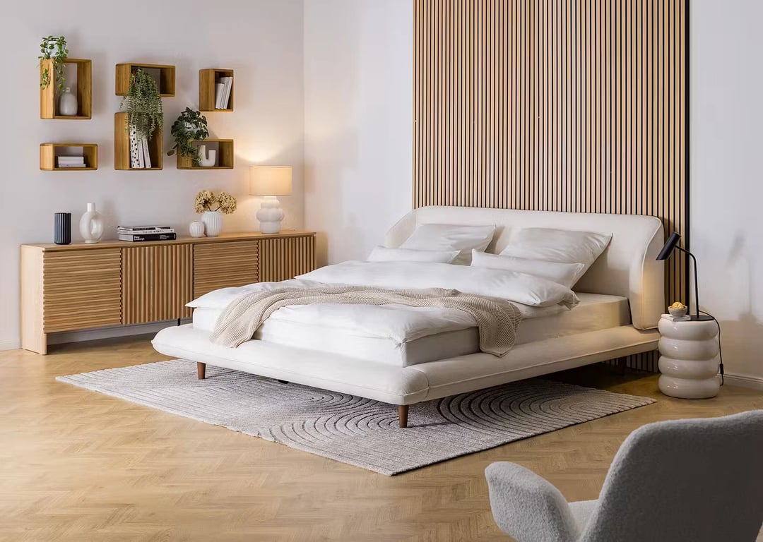 A curved upholstered bed frame crafted from 100% natural wood, treated to resist water, cracks, and insects — built to elevate your sleep and style.