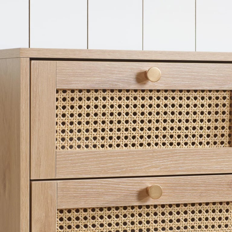 Warm natural wood meets woven rattan elegance in Liora—a 5-drawer chest that blends storage, style, and organic beauty.