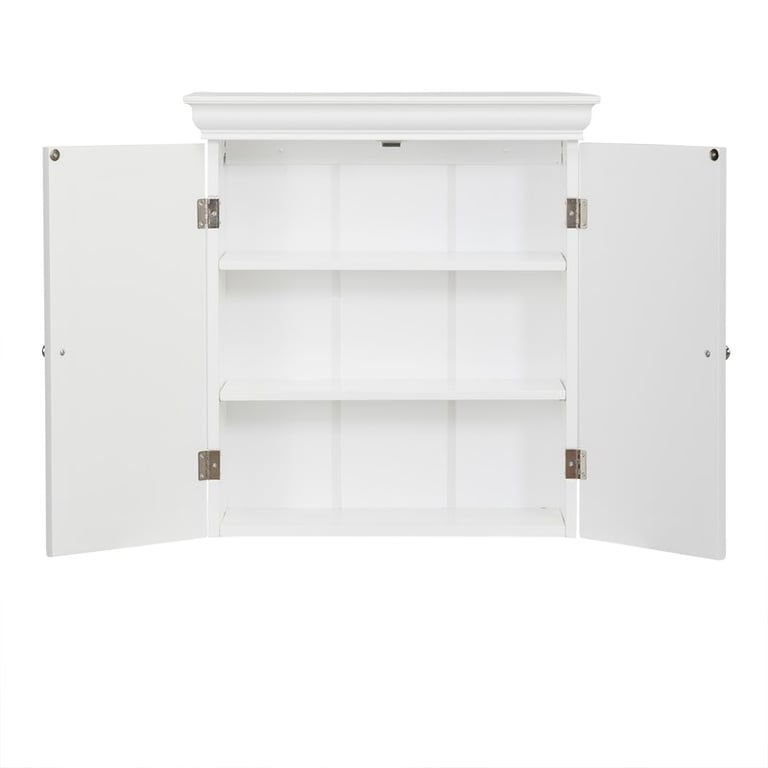 A modern wall-mounted bathroom cabinet crafted from natural wood with a sleek white finish. Designed with magnetic door closure and chrome-plated handles for elegance and convenience.