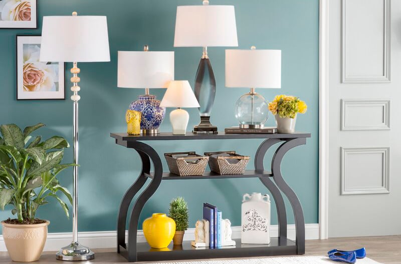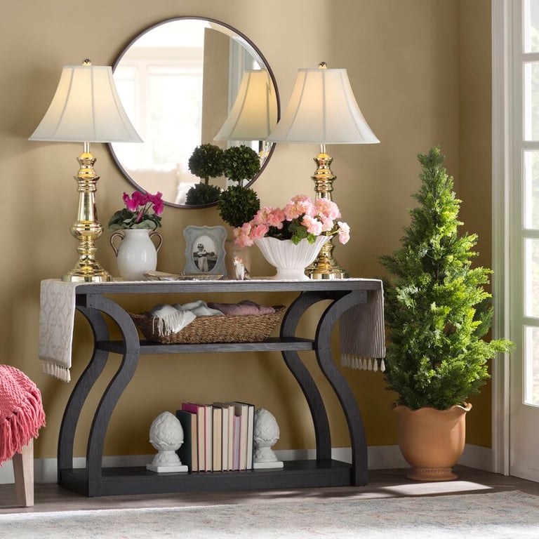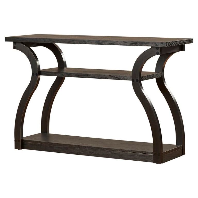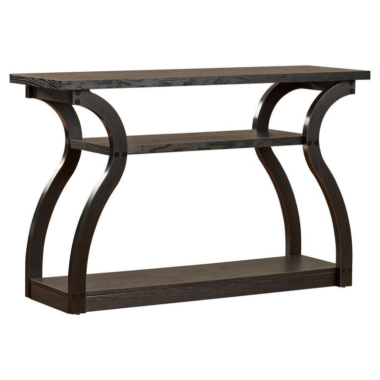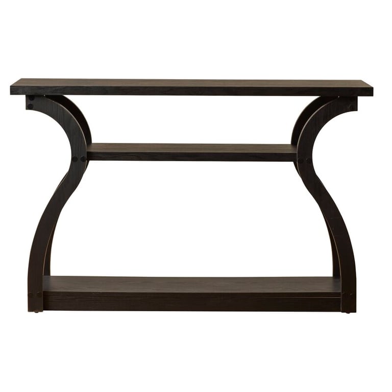 This subtle wood console table adds a touch of low-key sophistication and simple style to any ensemble, making it the ideal stage for any display. This table adds a stunning, geometric touch to any ensemble with its curved contour and openwork construction, while its deep black finish allows you to work with both earthy and neutral palettes.