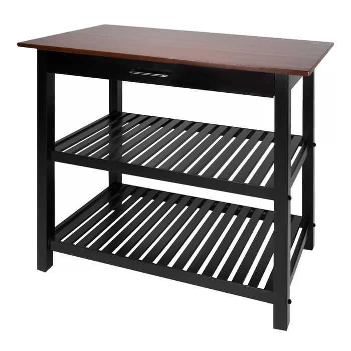 Enhance your kitchen style and practical features with Moppi Solid Wood kitchen Island With two wooden slats Shelves and a drawer. With a powerful worktop.