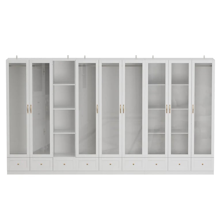 Enjoy the art of organization with our modular wardrobe collection, where function meets style. The collection offers three individual modular units, each with a distinctive look. Choose from classic white doors, glass displays, or combine them together to create a wardrobe system that matches your lifestyle and adapts to your storage requirements. It is very practical because it contains multiple units for storing your clothes and personal items. In addition to the elegance and beauty of the cabinet, the glass blends with the wood.