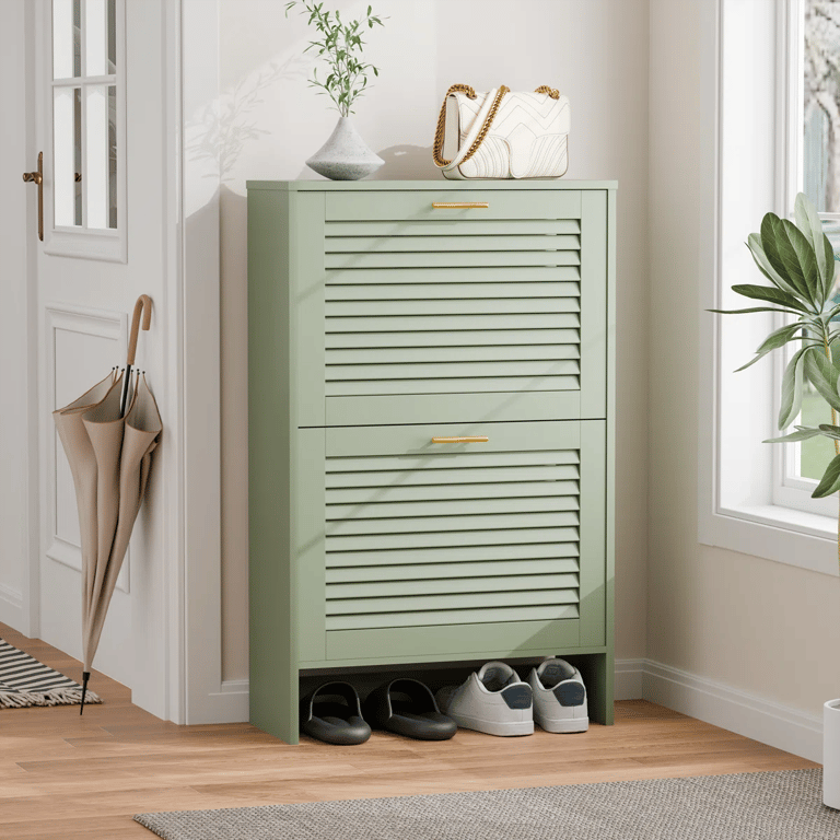 A stylish natural wood shoe cabinet featuring ventilated slatted doors and smooth flip-down openings for practical everyday storage.