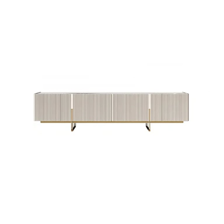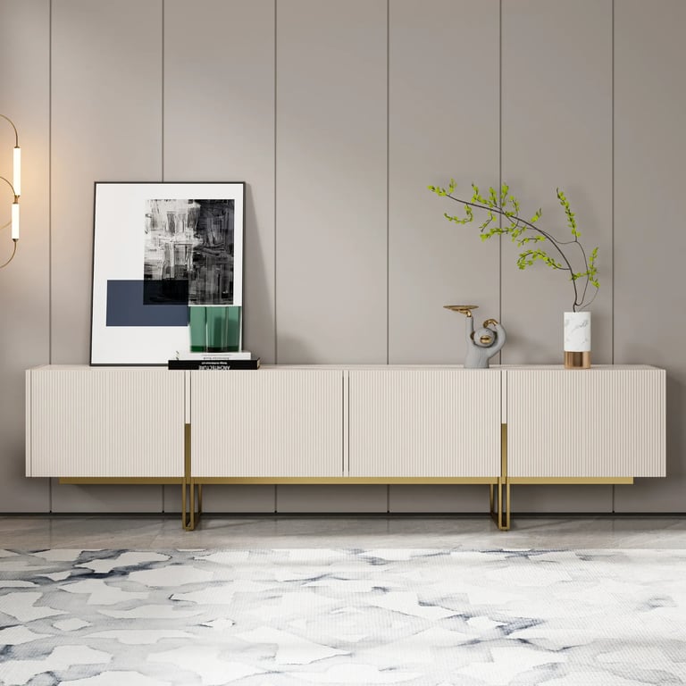 Valente Natural Wood TV Stand – Brass Base & Fluted Doors