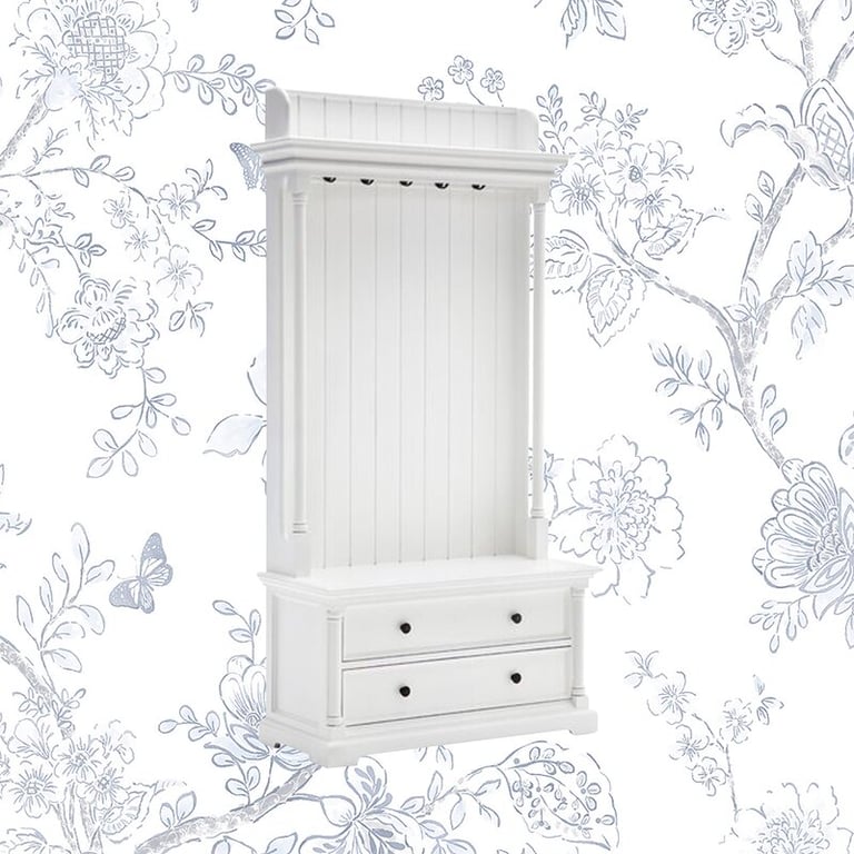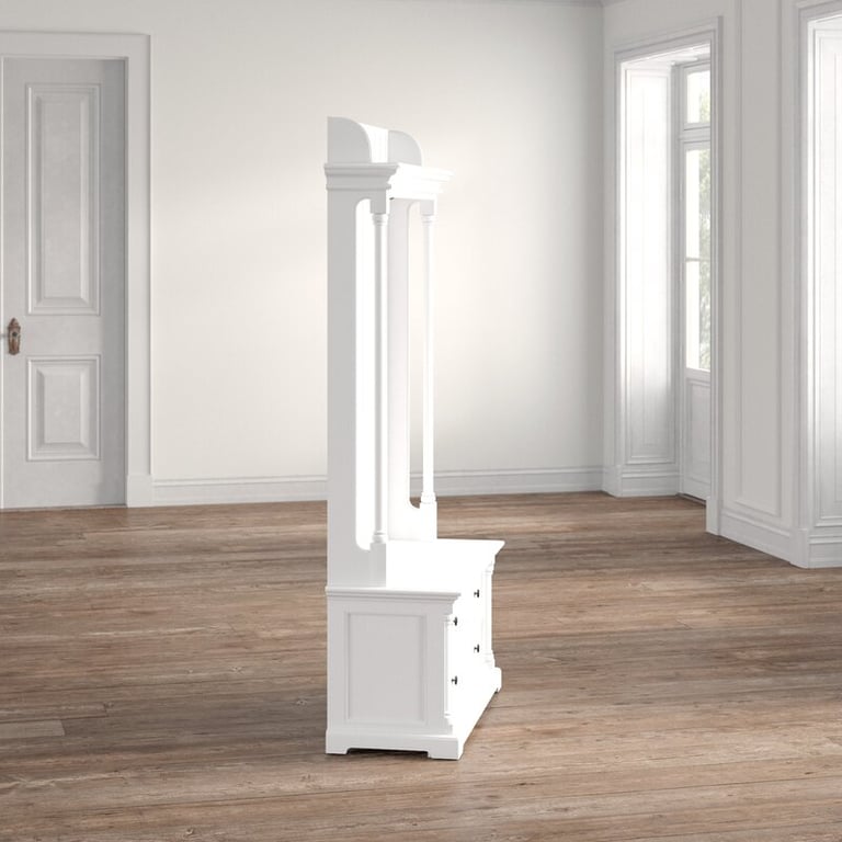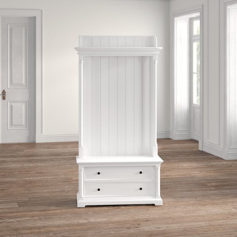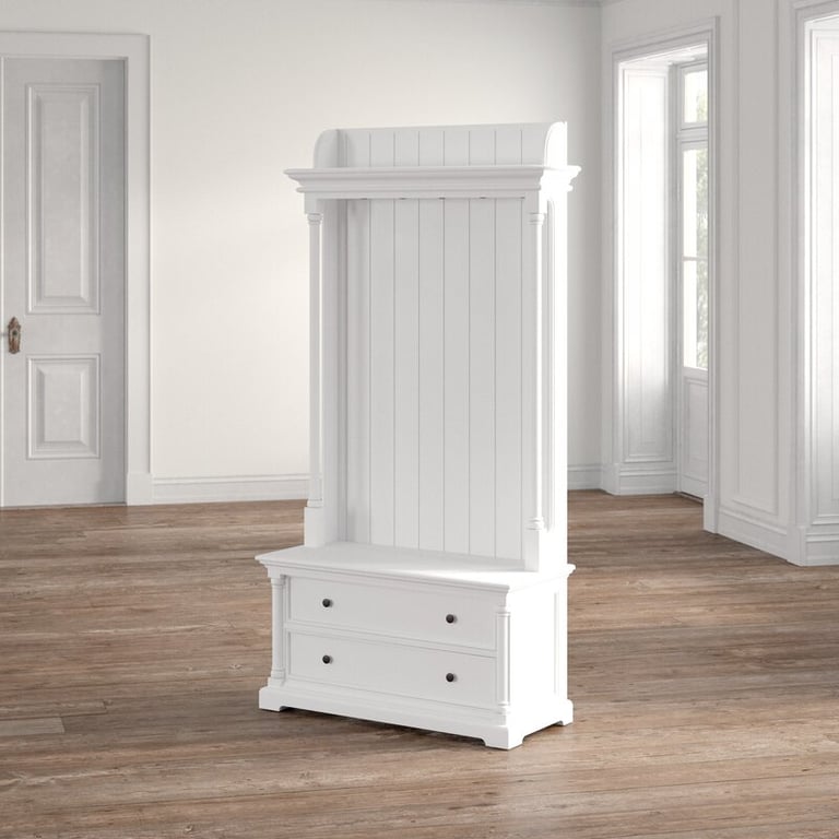 With this beautiful bench and coat rack hall tree, you can keep your entryway clutter at bay. A slender shelf runs the length of the unit, above the flared crown moulding, and provides an unexpected display space. The back of the unit has wainscoting for a typical farmhouse impression.